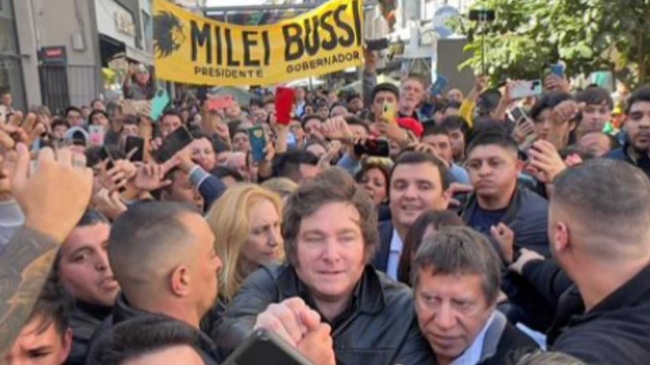 Milei y Bussi realizaron una caminata donde fue saludado por simpatizantes y comerciantes de la zona. Según destacaron desde el espacio, “demoró alrededor de una hora para hacer dos cuadras” debido a la cantidad de gente que se acercó a verlo.