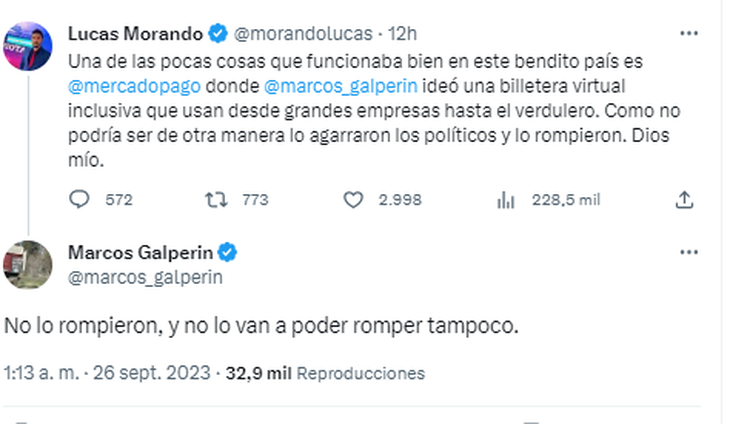 “Una de las pocas cosas que funcionaba bien en este bendito país es Mercado Pago donde Marcos Galperin ideó una billetera virtual inclusiva que usan desde grandes empresas hasta el verdulero. Como no podría ser de otra manera lo agarraron los políticos y lo rompieron. Dios mío”, expresó el periodista Lucas Morando en su cuenta de Twitter (X).