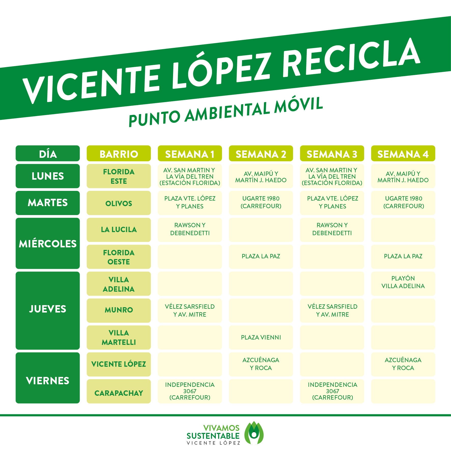 Estos puntos están compuestos por un vehículo eléctrico y un stand donde se reciben todo tipos de materiales reciclables tales como papeles, vidrios, pilas, cápsulas de café y botellas de amor, entre muchos otros. El vehículo recorre todos los días un barrio distinto de Vicente López y luego transporta los residuos, garantizando que los mismos sean reciclados.